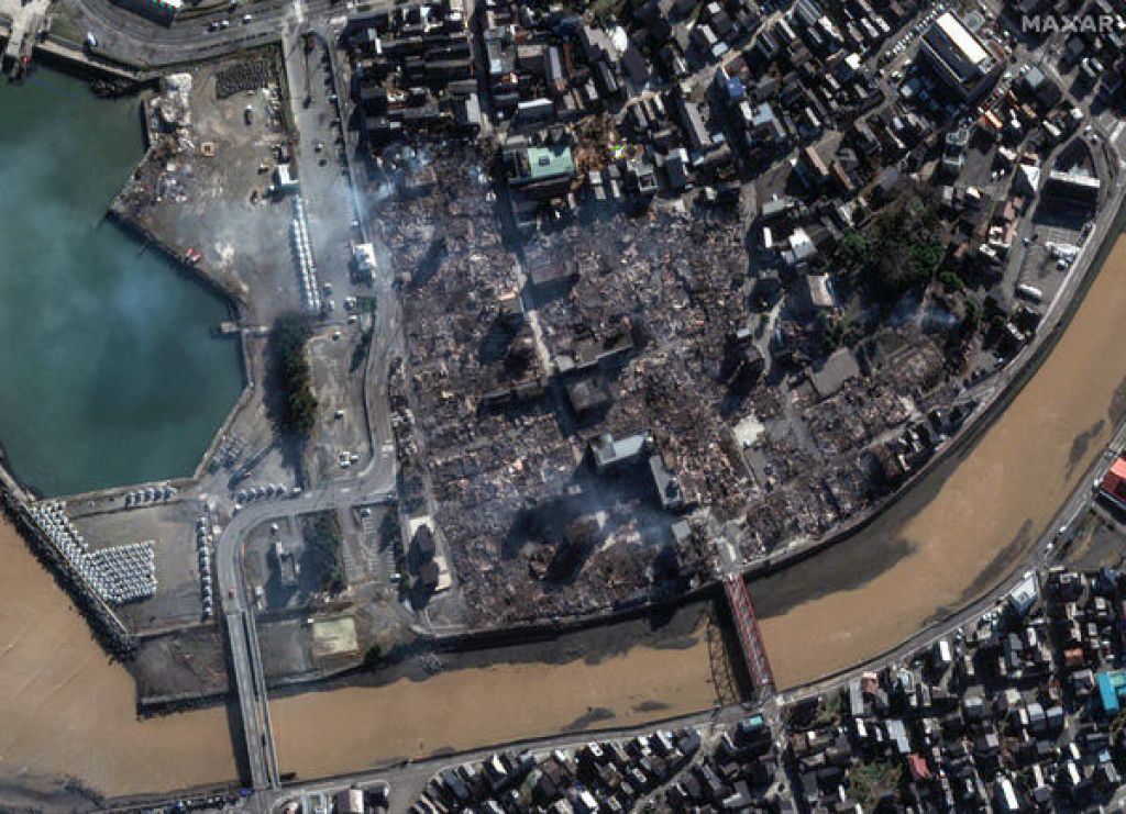 美国马萨尔科技公司拍摄到的卫星影像可以看到,地震前的珠洲市绿意盎然,但地震后许多房屋被夷为平地,影像中满是尘土,当地一座海港也满目疮痍,许多船只被海啸冲上岸。轮岛市在地震前房屋密集,但大火却几乎吞噬了一半的房舍,画面相当恐怖。