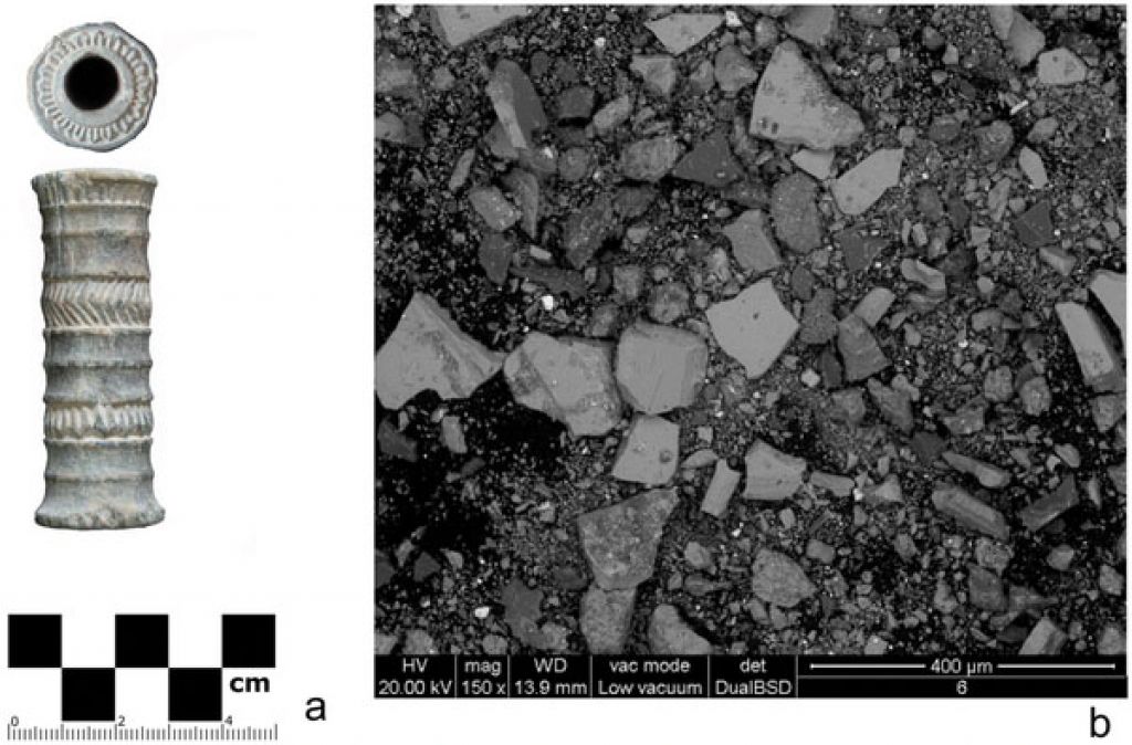 根据美媒ABC报导,一份2月刊载于《科学报告》期刊上的研究报告显示,伊朗东南部克尔曼省吉罗夫特地区2001年发生洪水后挖掘出了一处古墓遗址,其中一个小圆柱石瓶也随之出土,材质是绿泥片岩,外表有复杂的雕刻工艺,切口精细,约5公分高、2公分宽,尺寸比现代口红略小。