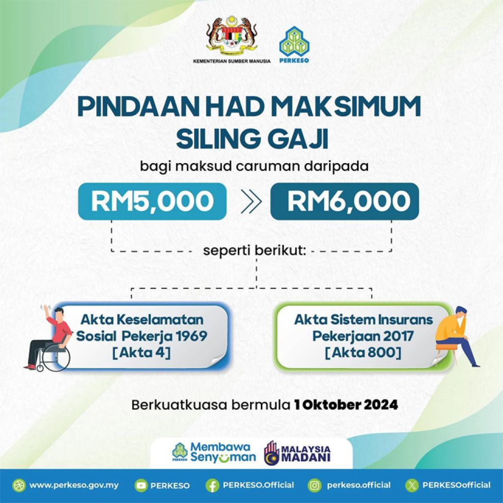 (吉隆坡1日讯)社险机构宣布,配合2024年雇员社会保障(修正)法案和2024年就业保险系统(修正)法案通过,该机构从即日起将社险投保薪资上限从5000令吉调至6000令吉。