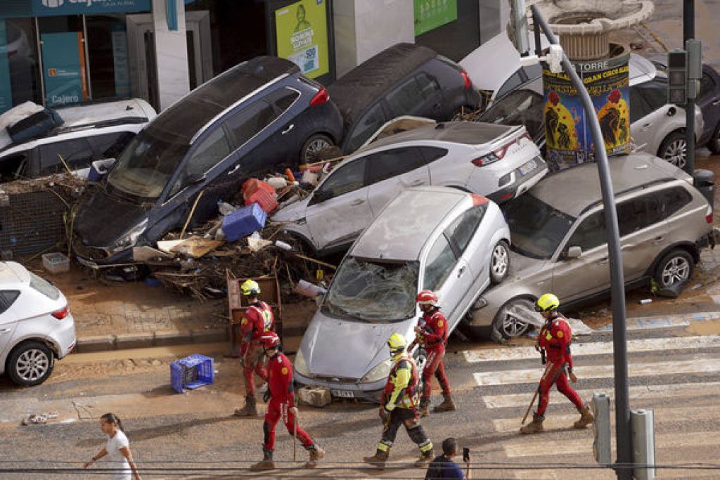 综合外媒报导,10月29日,西班牙东部瓦伦西亚省突降暴雨,当地居民措手不及,许多街道瞬间变成河流,桥梁、建筑物和轿车被无情冲毁,流动的水势如同海啸,导致车辆在洪水中相互堆叠。事故发生后,政府与紧急服务机构迅速派出直升机与救生艇展开救援,设法解救受困民众,减少人员伤亡。