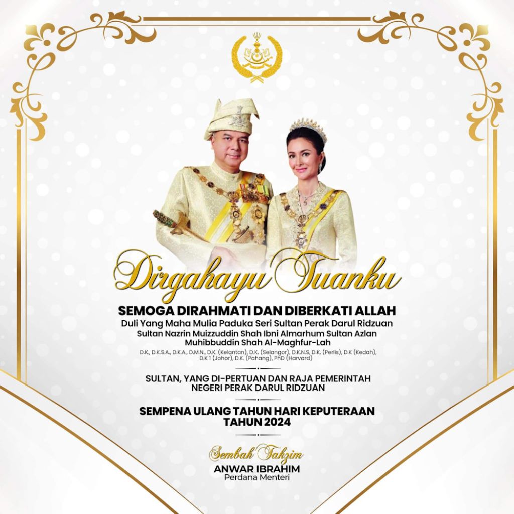 (吉隆坡1日讯)配合霹雳州苏丹纳兹林沙殿下庆祝68岁华诞,首相拿督斯里安华送上祝福。