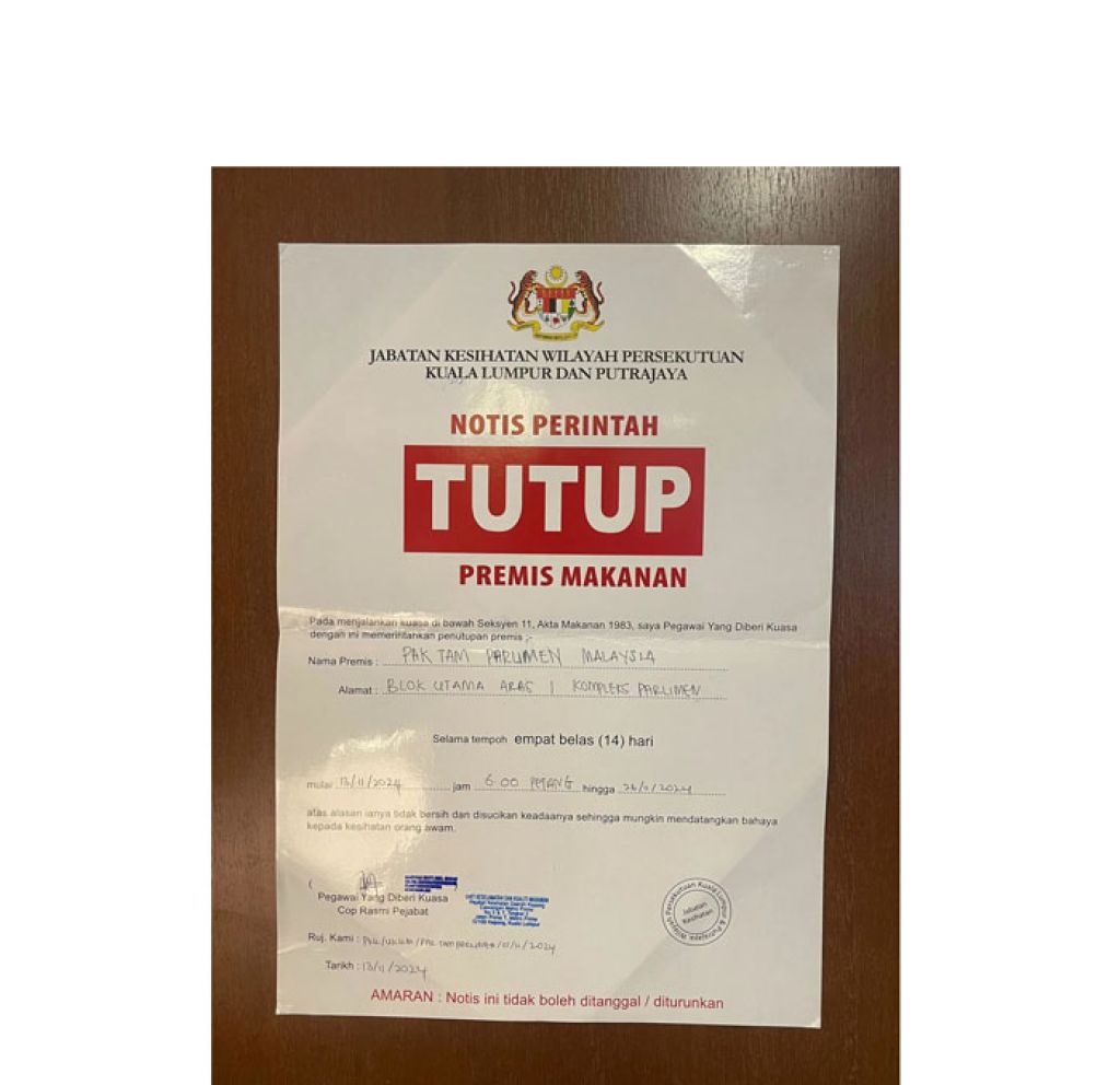 国会餐厅卫生不达标 卫生局勒令停业两周 14 11, 2024 登载于 大马 (吉隆坡14日讯)国会餐厅卫生状况不达标,卫生局勒令停业两周。 联邦直辖区吉隆坡与布城卫生局是援引1983年食品法令第11条文,以未清洁与消毒到位,可能对公众健康构成危险为由,勒令位于国会大厦主要大楼的餐厅停业。 这项指示从本月13日傍晚6时生效,为期两周至本月26日。 卫生局将在14天后再进行检查,以决定餐厅是否可以恢复营业。 卫生局食品安全与质量单位是于周三突击检查国会餐厅。 另外,国会下议院议长丹斯里佐哈里表示,他将召集所有涉事者见面以了解情况。 他预计,调查结果将在周四出炉。 更多相关: « 第二财长:128亿令吉无人认领 贪污案告密者接死亡恐吓 警察总长:已开档调查 »