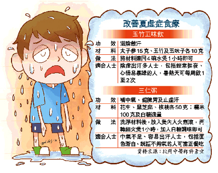许推介夏虚症人士可煲“玉竹五味饮”饮用,材料包括太子参、玉竹及五味子,有滋阴敛汗作用,适合阴虚出汗多人士,包括经常捱夜、心情易暴躁的人。至于中气不足、容易出汗人士,包括面色苍白、说话不够气的人,可烹调“三仁粥”当正餐吃,有助补中气、健脾胃及止虚汗,材料包括花生、黑芝麻、核桃、糯米及白糖,当中糯米可补中气、止虚汗,花生可健脾和胃、养血止血。