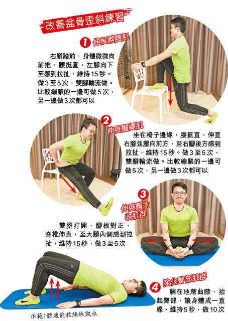 高低肩、头部侧倾及受到痛症缠身,元凶或是盆骨歪斜。物理治疗师表示,坐下时跷脚、站立时没有站直或常侧身用电脑与看文件,或做家务时扭转身躯等坏习惯,都可致盆骨歪斜。长远令身体重心偏离正中,两侧受力不平均,增加各种痛症、脊椎侧弯或椎间盘突出风险。纠正姿势、多做伸展及强化肌肉练习、电脑放正中位置,均有助赶走周身痛症。