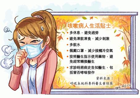 黄称,不少持续咳嗽病人都有不停转医生的习惯,曾有病人因咳嗽轮流向数名医生求诊,最后情况无好转,拖足一个月才正视问题向专科求医。她提醒病人应避免转换医生,因为由同一医生跟进,可了解病情有否恶化及进展情况,有助医生了解病人对药物的反应及对症下药。市民持续咳嗽三天或以上无好转;痰液呈黄色或绿色;持续发烧、越烧越高或高烧不退;病发时疲倦不堪、全身无力;病童没有兴趣玩或反应慢,都应尽快求医,可能是气管炎、肺炎,双重感染或细菌感染等症状。