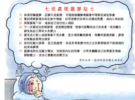 陈秀芬称,每个人的噩梦都有不同的象征意义,难以一概而论,若经常发噩梦或反覆受某个梦境困扰而影响生活,例如情绪不安、恐惧或精神不振,难以专注工作,或因噩梦导致不敢睡觉、睡眠质素转差,都应该求医。