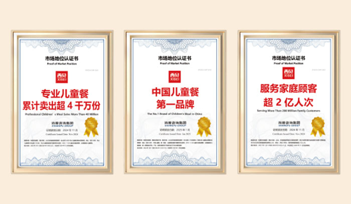 西贝其实一直都是这个赛道的专业选手。今年1月,尚普咨询集团向内蒙古西贝餐饮集团有限公司(以下简称“西贝”)颁发了市场地位证明书——“西贝XIBEI,中国儿童餐第一品牌”,连同去年11月颁发的“专业儿童餐累计卖出超4000万份”、“服务家庭顾客超2亿人次”权威证明,三项重磅认证,让这个37年的餐饮品牌重新成为了行业焦点。