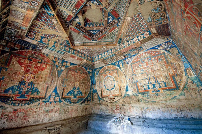 八九岁的小姑娘爬得飞快,几个考古队员互相拉着拽着,好不容易在陡峭的崖壁跟上她。爬到山顶,几近黄昏,一抹夕阳打在山顶密密麻麻的洞窟顶上,金碧辉煌。霍巍呆立在原地,当踏入其中一个较大的洞窟,他的眼泪几乎流了下来——满目丹青!中原的龙凤、波斯的双狮、克什米尔的神佛菩萨……洞窟壁画融合了多元艺术,青、蓝与绛红色彩强烈碰撞,共同勾勒出一个轻盈雅致又质朴浑厚的佛国世界。四壁之上,绘满了象征佛教宇宙观的曼荼罗,也许得益于天然矿物颜料,相当一部分壁画保存完好,历经千年依然色彩鲜明,宛如一幅缀满珍宝的巨大织锦。