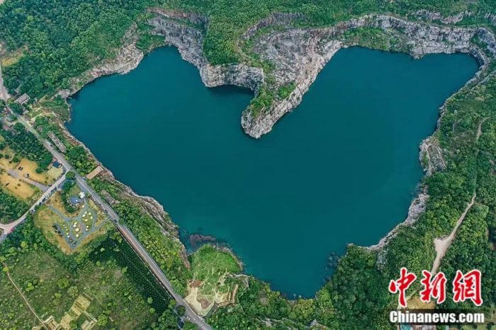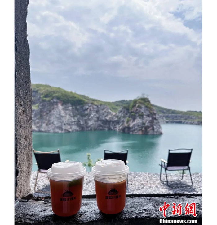 “深蓝计划X”是一家利用废弃矿坑和老厂房改造修建的咖啡馆,视野所及皆是山水。该废弃矿坑呈浪漫心形,冷冽的岩壁和深蓝的湖水形成冷峻、沉静的氛围,被网友誉为“小冰岛”。