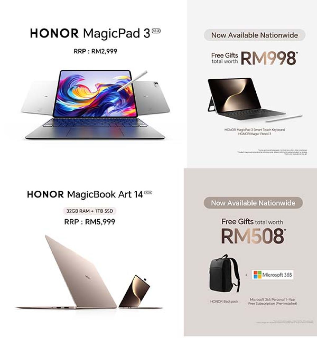 (吉隆坡2025年8月25日讯)国人翘首以盼的HONOR旗舰双星--HONOR MagicPad 3 平板电脑与 HONOR MagicBook Art 14 2025笔记本电脑,今日正式登陆全国HONOR线下体验店、授权零售商以及各大官方线上平台,全渠道同步开售!作为 HONOR 热门平板系列的重磅新品,HONOR MagicPad 3延续轻薄便携的设计理念,全面升级性能表现,不仅以轻巧便携的机身提供PC级强大体验,更打破传统PC的局限,解锁更多可能,为用户打造真正高效、自由的移动生产力工具。