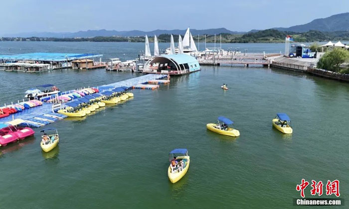 休闲小船在308平方公里的水域中感受宁静辽阔。在庐山西海,市民游客可登船游览,欣赏“中国最美的湖光山色”,可乘风破浪,体验刺激好玩的水上项目,夏日“亲水经济”持续升温。
