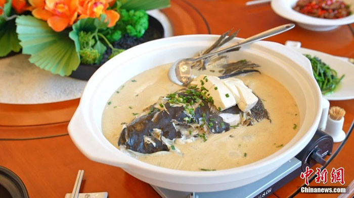 鱼头炖豆腐,最讲究的就是新鲜二字,刚捕捞的鱼被厨师三下五除二地收拾好,无需添加过多调料,加上少许盐 放入嫩豆腐,煮成浓浓的奶白色汤,撒上葱花即可出锅。汤汁入口,鲜美的鱼味在嘴中经久不散。