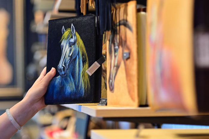 “伊犁是‘天马之乡’,我们在皮毛一体的马皮上进行手工绘画,每幅图案都是独一无二的,让非遗与旅游深度融合。”店长茹柯耶·艾散介绍,店铺还开发出马毛笔记本、首饰等文创衍生品,深受年轻人喜爱。