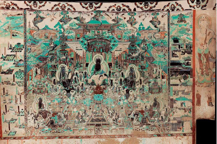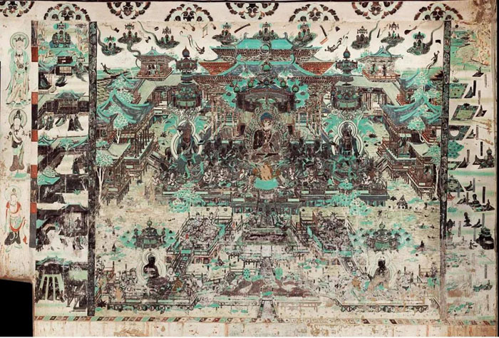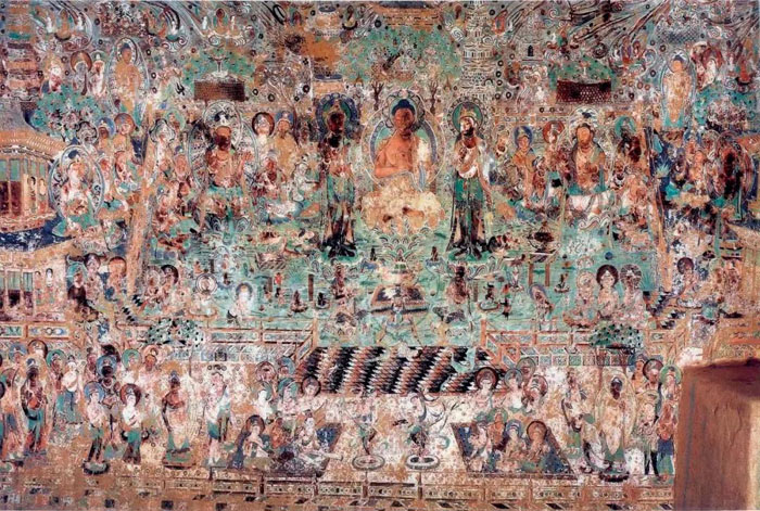 敦煌登峰造极的壁画,以第220窟为代表。此窟壁画每幅都是上乘之作,尤其是南壁《无量寿经变》,气势恢宏,占据整面墙。佛教经变画,是由佛经变成的画作,以供信众更直观地认识和理解佛教的历史与教义。画中,无量寿佛和三十多位菩萨置身七宝池中,金沙铺地,碧波荡漾,楼阁耸峙,天女散花,呈现出神灵居住的极乐世界。