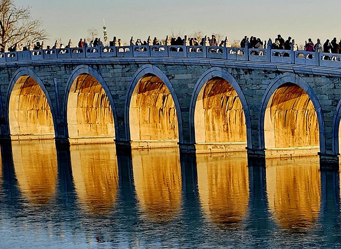 如此说来,当年是建桥者特意营造了金光穿洞,那如此美景为何不禀报给乾隆皇帝,也让他领略一下呢?其实,金光穿洞至少在20年前还没有人关注,连记录颐和园历史的《颐和园志》《颐和园导览》及《三山五园史话》等书籍也未提及。在颐和园工作了20多年的刘先生曾告诉我,他可以说走遍了颐和园的每个角落,10多年前还没听说过十七孔桥冬季有金光穿洞,这是近些年因摄影爱好者偶然发现,并引爆京城摄影圈的。此后每年冬至前后,许多游客才慕名到此。