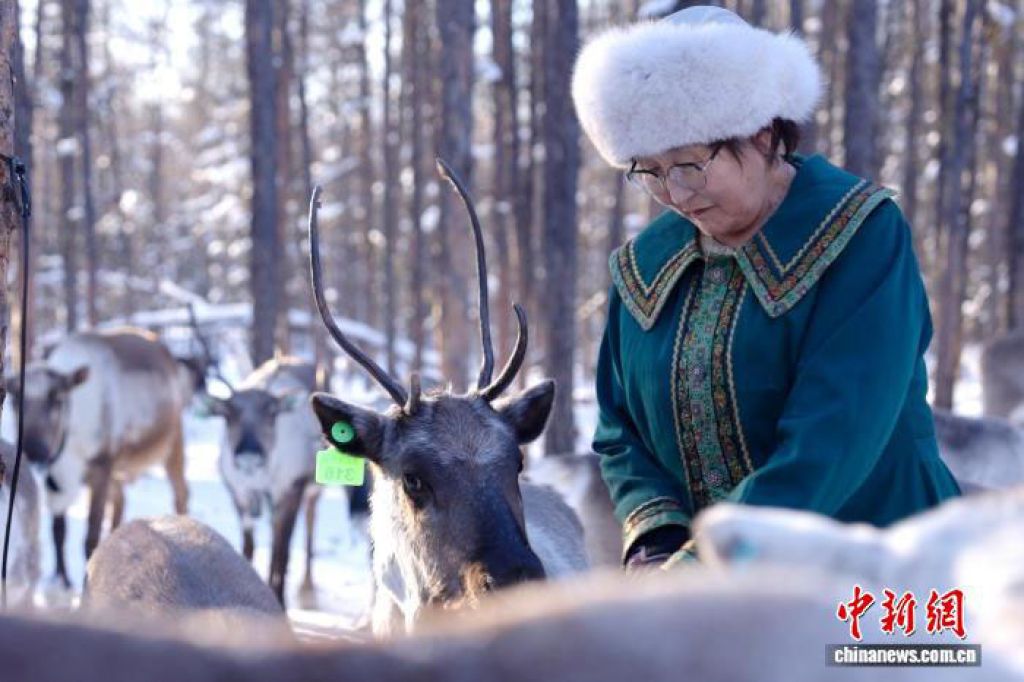 使鹿鄂温克人得克沙是“中国最后一位女酋长”玛丽亚·索的女儿,她带着母亲留下的100多头驯鹿,至今仍生活在泛北极圈泰加林最南端的内蒙古阿龙山上。