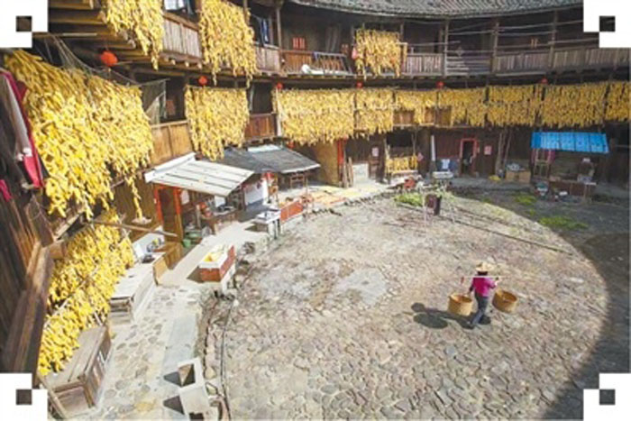 方形土楼沿四边向内建屋,中间留出宽敞院落或建筑房屋,普遍在三层以上,最高达五层。