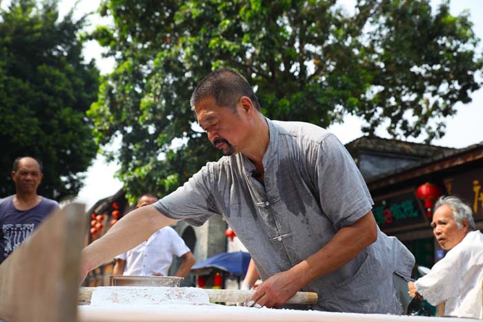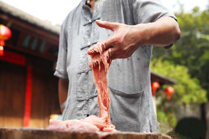 肉燕好吃,却不易做。“在冬天时,地瓜粉洒在身上和汗水混合在一起,异常寒冷;在夏天时,在高温下不断敲打肉泥,会让身体由于大量流汗而虚脱。”陈君凡说,在肉燕制作的每个环节、每个不同的时间段,都有不同的挑战。