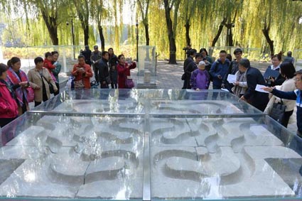 而最近两件回归的圆明园文物是乾隆御笔“熙春洞”石匾额和嘉庆御笔“称松岩”诗刻石。由于两件文物还在修复,其复制品亮相本次展览。