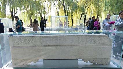 另一件堪称珍贵文物的是圆明园“柳浪闻莺”坊楣,也就是石质牌坊上的一部分。