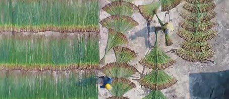 晾晒的场面也蔚为壮观,在高空中俯瞰下,蔺草摆成矩形和扇形,在黄绿相间的颜色点缀下,宛如一块规整调色盘。这些晒干的蔺草,将会再次浸水晾干,随后走上编织机,经过传承百年的古法打制,变成一张张草席。
