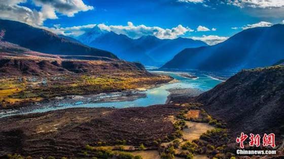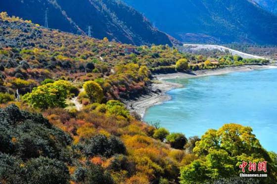 时值秋末冬初,全长504.6公里,最深处6009米的雅鲁藏布大峡谷呈现出别样巍峨壮观,两岸五彩交织的森林上雪峰林立,谷底奔涌的雅鲁藏布江碧水绕田,宛若童话中的仙境。