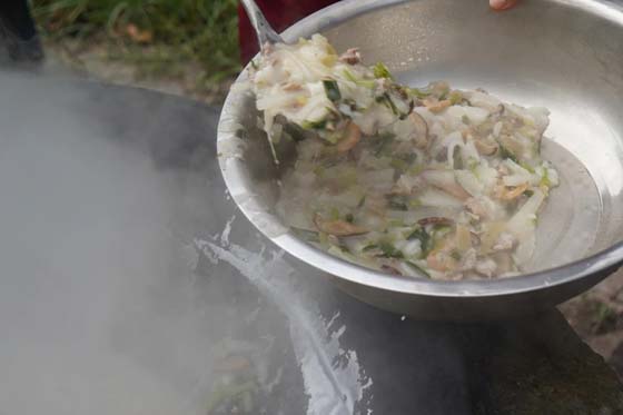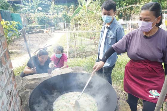 一班热心的妇女村民2013年自发复修一块农地,用石砖铺路、开田耕作,甚至搭建一个柴灶,老一辈更捐出家中的生铁镬及石磨,变成今天的菜园地。菜园地提供一个共用的休憩空间,种萝卜、包粽、炸贺年小食,每家每户都有自家菜谱,透过食物在菜园地相聚,慢慢形成了一个无形的社区连结宝藏。村民华妹教记者煮没有固定材料、传统乡村食物“攋镬边”。她说,旧时村民过年过节,用石磨磨米制作“攋镬边” 给客人吃。村民烧柴灶及生铁镬,华妹把芹菜、猪肉、萝卜、冬菇、冬菜等材料炒熟,用粘米粉加水取代石磨磨米的粉浆,“攋镬边”的精髓是镬边有足够热力,粘米粉浆沿镬边倒下去,做到“攋镬边”效果,粉浆熟透就可以一口气铲下去。“攋镬边”口感像一堆滑滑的粉团,配合芹菜冬菜,像潮州菜的味道。