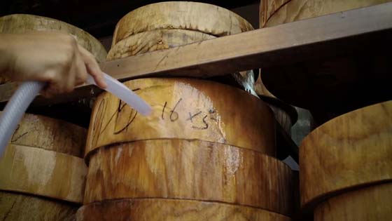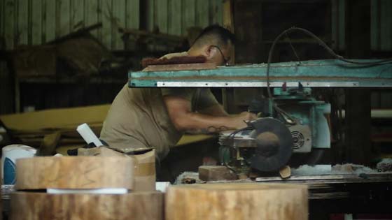 “行内老一辈都知道,如果要做木家具,就必先‘去性’,简单而言,去性就是将树木砍下后泡水,然后再进行干燥处理,这样可减低木材遇上热胀冷缩的问题,防止木变形。但做木砧板就不同了,先要因应木的软硬程度而决定,例如松木砧板,木身较软,水分又容易流失,所以砍下之后就要把它放在水里浸,用的时候才在水中捞起,然后刨皮切割,因应所需大小制作出不同松木砧板;而櫶木砧板就刚好相反,它的木身较硬,不用泡水,直接刨皮切割,制作好砧板后,会在包装前加上适量的油分和营养液以作滋润,目的是防止爆裂。所以当一个櫶木砧板包装被拆开,只要有一滴水沾在砧板面,就要开始好好保养,否则,砧板会由小小的裂痕开始腐坏。”