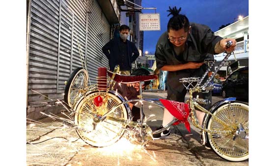 这个晚上,一班lowrider单车爱好者聚在油麻地单车店DJ BMX Workshop,准备出发夜游。他们的lowrider单车车架用上非金即银的麻花卷,金或粉色的车轮、绒面单车凳、龙头小喇叭、还有各种浮夸夺目的装饰,蔚为奇观,不时引起旁人好奇的目光。可是骑上车,却未必舒适,因为lowrider单车的设计,参照一款巡航电单车,体形又大又重,亦不可转波。