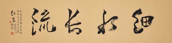 另外林夕以行书写“细水长流”,来自他形容为没有名份的夫妻、王菲的《红豆》歌词:“等到风景都看透,我会陪你去看细水长流。”他透露,创作过程也颇有趣,灵感竟来自他当时追看的日剧《恋爱世纪》。“看到木村跟女友分手前的沉默,因为分手的预感笼罩整个厨房,女的神不守舍弄焦了一锅红豆汤,我看到眼红红,同时我被追交词,于是有感而发,拿红豆入词,并以此为歌名。”林夕指“细水长流”四个大字,太工整嫌呆板,爱情是跃动的,如旋律有起伏,故用行书带出流水的线条,另特意选了一种蝉翼纸,贪其底色有暖意有古气,寄意天下有情人感情既历久又常新。