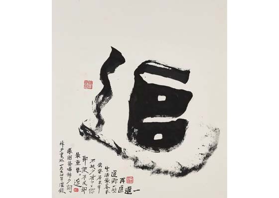 “构想这幅‘追’的时候,曾想过用中体写最深入人心那段歌词;后来又写了好几幅‘一追再追’的大字,最后还是追求精简,写超大一个追字,用竹制的‘毛’笔,刨成一簇竹丝的笔锋,吸墨有别于一般的毫毛,很难控制,每次挥笔犹如冒险,效果反而意想不到。”现场看预展,“追”的枯荣相修,恰似人间苦追的过程吧,欲断难断。