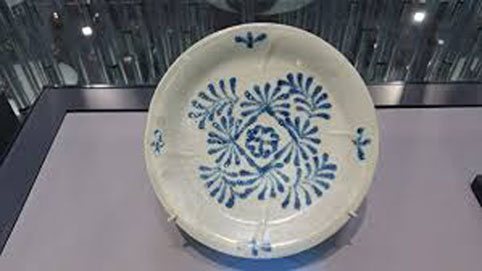 “黑石号”上三件完好无损的白釉钴蓝彩盘,引起陶瓷界的轰动。经考证,它们出产于唐代东都洛阳附近的巩县窑,是迄今发现的最早、最完整的中国青花瓷,且与扬州唐城遗址出土的青花瓷碎片纹样类似,(唐代的扬州是海外贸易的重要货物集散地与港口),这种纹样在唐代陶瓷、金银器中罕见,却与同船发现的金盘纹样相仿佛,可见唐青花主要是供出口外销的。
