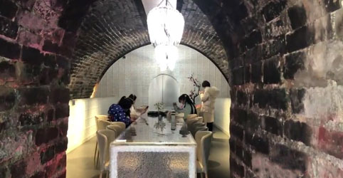 走进餐厅,巨大的冰凌吊灯将整个屋子映照的古朴雅致,百年前的石头墙壁上配有琉璃制成的冰块装饰。细细观察,还能看到石砖上建造工人的刻印落款,浓重的历史气息仿佛让食客们置身于百年前的宫廷之中。