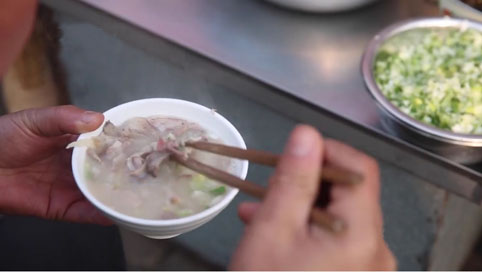 李春生一家三代以卖猪汤为生,手艺从爷爷传到了他这一辈,他摆摊30多年,猪汤从5角一碗卖到了4元一碗。他说,90%的荫城人都是他的老顾客。