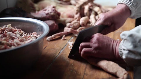 李春生说:“选猪要选生猪的优质下水,买来后先浸泡,第二步就是刮毛,洗肠子,第三步就是浸过,焯上一遍,第四步就是煮肉,出锅,第五步就是切肉,第六步就是出汤,说着简单,但是实际特别烦琐,从收拾下水到炖汤得10个小时。”