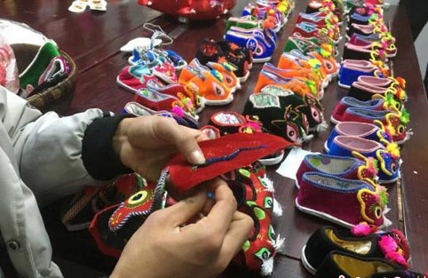 韩恒涛说,缝制虎头鞋最耗时的是纳鞋底。“鞋底有许多讲究,需要用浆糊将布料一层一层粘起来,晒干后做鞋底材料;按鞋子的尺寸剪鞋底形,再包边纳鞋底,鞋底上一个花型就要钩上3针。”