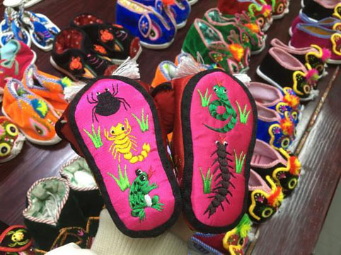 “孩子出生第一双鞋子最好是猪头鞋,猪是最有福气的动物,它耳朵上的蜘蛛刺绣代表‘喜从天降’;而象头鞋的寓意是吉祥如意。红色鞋面表示辟邪,紫色代表平安长大。”他说。