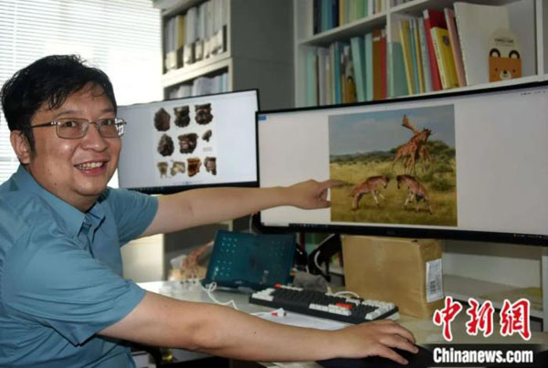 王世骐:系统发育分析显示,现生长颈鹿与獬豸盘角鹿均属于长颈鹿超科,它们头骨和颈部的形态差别很大,但都与雄性的求偶斗争相关,而且都向极端的方向演化。