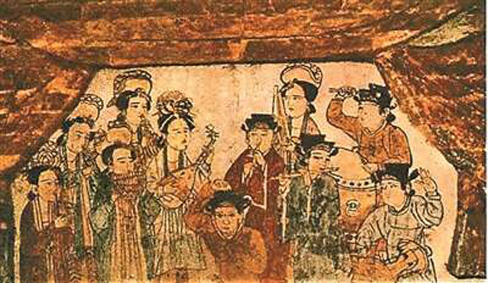 在上演杂剧时还有演奏杂乐与之相配。散乐早在周时就有记载,历代也多与杂技百戏相杂,包含多种民间技艺与音乐形式。如河南禹县白沙宋墓出土的壁画中的散乐表演,除了中间有一舞者外,其余十人均有演奏乐器,其中1人吹笙、1人吹排箫、3人吹筚篥、1人吹横笛、1人弹琵琶、1人击拍板、1人击大鼓、1人击腰鼓。