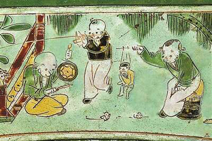 北宋后期至南宋时期,战乱频繁、生育多难、婴儿夭折率很高,当时的人们认为儿童容易受邪祟侵扰,再加上宋代有“不举子”(即生了孩子不养育,把婴儿溺死或扔掉)之风,墓葬中便出现了许多婴孩图像,来祈求孩童健康长寿。天真无邪的孩童或是赤裸或是身着肚兜,或是站立或是蹲跪,手里拿着杖头傀儡等玩具尽情地玩耍嬉戏。河南省济源市勋掌村出土的童子傀儡戏枕,亦是祈求、福佑子嗣的典型代表。宋人把枕头视为接触身体的重要物品,并赋予其镇宅、驱邪、宜男的功能,相信如果孩童枕睡这种枕头,便可以保佑孩童的身体健康。