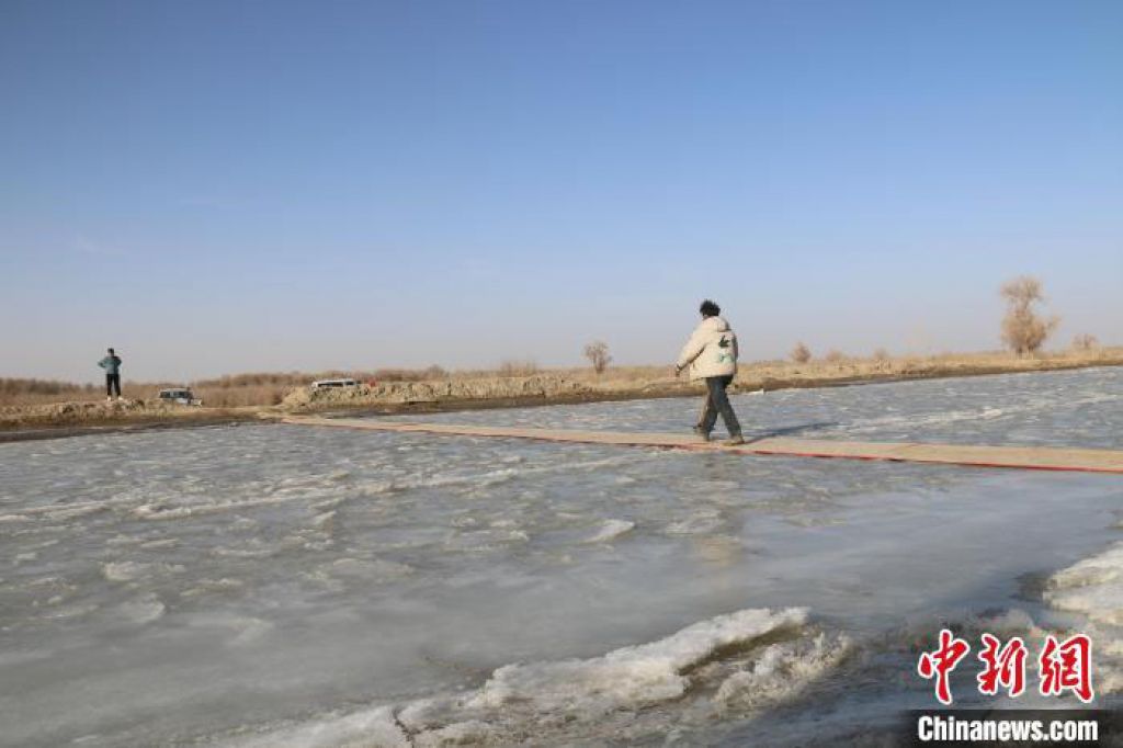 在经历陷车、救援、刨坑后,一路飞驰的车辆突然刹停,一条30米宽的大河拦住了去路。和田地区于田县达里雅布依乡党委书记林思阳安排村民们在冰面上铺了一条木板路。记者一行小心迈步,走进了中国“最后的沙漠原始村落”。