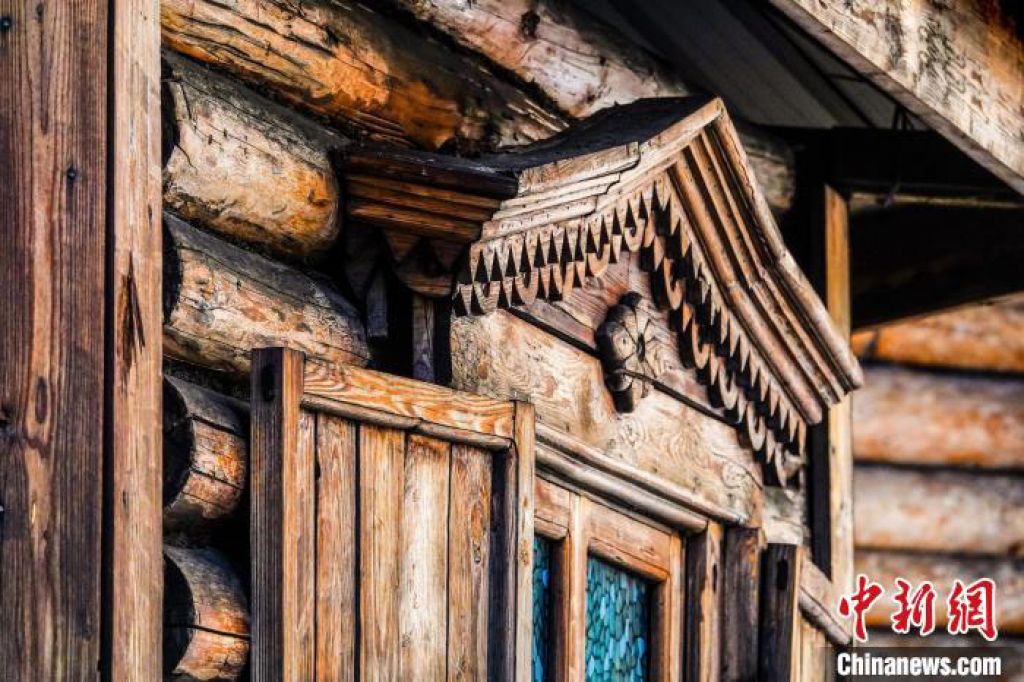 走近李祖庆家的木刻楞仔细看,房檐、门檐、窗檐上下的彩绘和雕刻让整座木屋灵动起来:门上檐用刀子刻出云字边;窗上下檐边刻着牡丹花;房檐则是镶嵌成型的“3D祥云”。