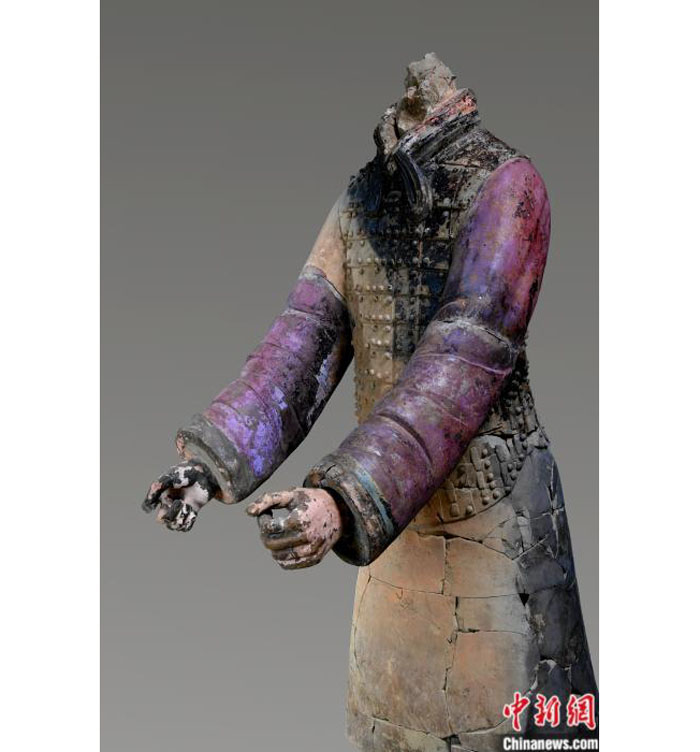 田静介绍,许多兵马俑色彩鲜艳,配色大胆,与当下流行的“多巴胺穿搭”如出一辙。这些服装残留的颜色多数已经脱落在淤土上,有红、绿、蓝、紫、青等,经过色块对比,俑坑中已发现17种不同的色彩。