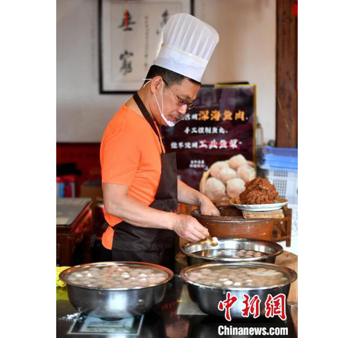 “打鱼丸讲究手法和刀工,轻重缓急都是讲究,直接影响鱼丸的口感,体现鱼丸师傅的功夫高低,有学问。”刘景舒说,鱼丸下入汤中煮沸捞出,根据个人喜好加之葱花等小料,鲜香味美;煮好的鱼丸,色泽洁白晶亮,食之滑润清脆,汤汁荤香不腻。