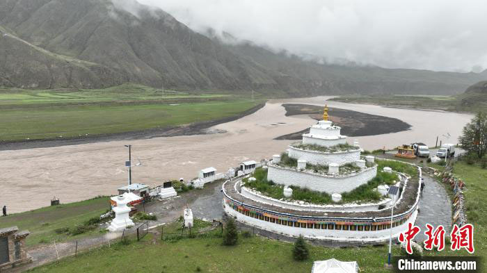 连日来雨水持续,清晨的通天河挟卷泥沙,波涛涌动,河中央的月牙形沙洲被冲刷出柔美的弧线。四周群山青翠、雾霭缭绕,白塔静静伫立在古渡口边,似水墨画颇具诗意。石阶延伸处,牧人缓缓走过转经筒,远处村庄笼罩在一片朦胧中。