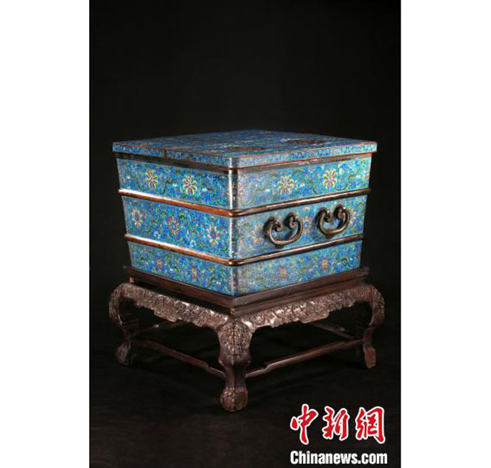 沈阳故宫院藏的清乾隆款掐丝珐琅宝相花大冰箱,内部为锡板里,内加隔层木板,放入天然冰可使食品保鲜,其盖面有两个镂空团寿字纹孔,可散发冷气。