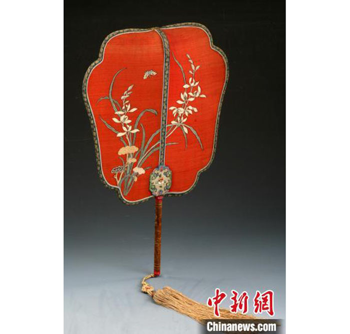 清宫扇子的功能不局限于消暑,更是一种装饰、一种艺术品、一种文化。据张国斌介绍,以沈阳故宫院藏的清檀木柄大红缂丝兰蝶扇为例,此扇为清宫后妃日常生活用品。扇顶部微向后弯曲,便于扇用;扇面为大红地,以缂丝工艺制兰花花卉,兰花根部长有灵芝,上部彩缂蝴蝶;扇骨及边框以彩绣锦边包镶;扇柄为木制,表面刻有花卉纹、弦纹,柄两头镶有染红色骨饰,柄底部系有黄色丝穗。
