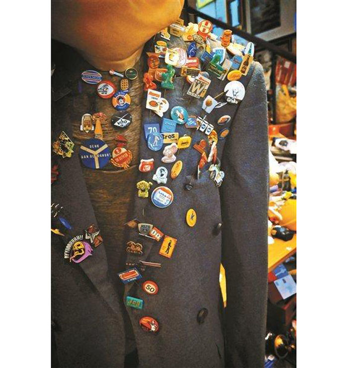 对着这些千奇百怪的玩具,怪怪如数家珍。店门口立着1:1的《鬼娃回魂》的角色手办,手办身上灰色毛呢西装上,插着几十个五颜六色的胸针,“那是上世纪60年代德国和荷兰的徽章胸针,都是扭蛋机里抽的。”