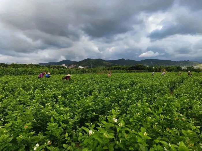 盛夏,正是采摘茉莉花的好时节,站在闽侯县祥谦镇新垱岛茉莉花种植基地内,百亩茉莉花散发阵阵清香,此时也是茉莉花茶制作的最佳时节。