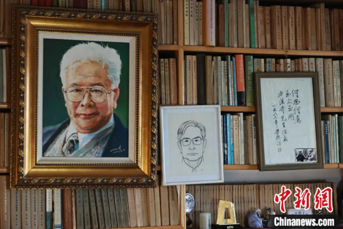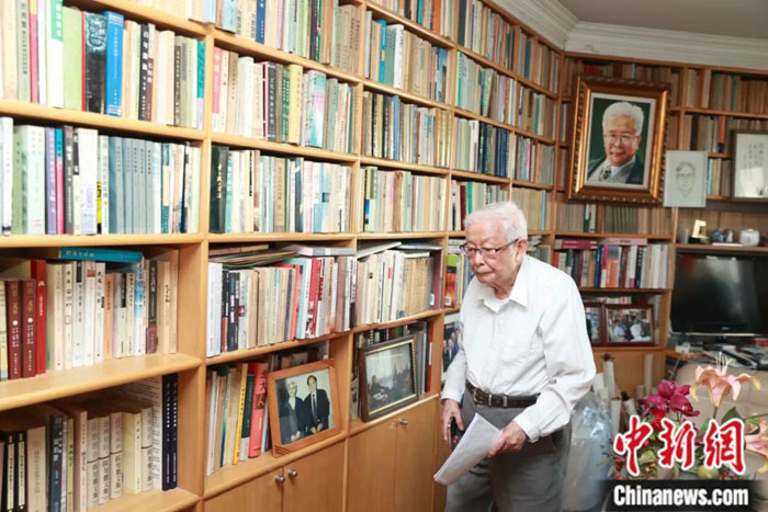 走入方汉奇家中,书籍的馨香游离在每个房间。约30平方米的书房三面环书,墙上、书架上陈列着往日和梁漱溟、金庸等大家的合影。落地至天花板的特制书架分里外两层,说是藏书万册也毫不夸张。一架望远镜,一把折叠梯,供房屋主人调遣书架上的千军万马。